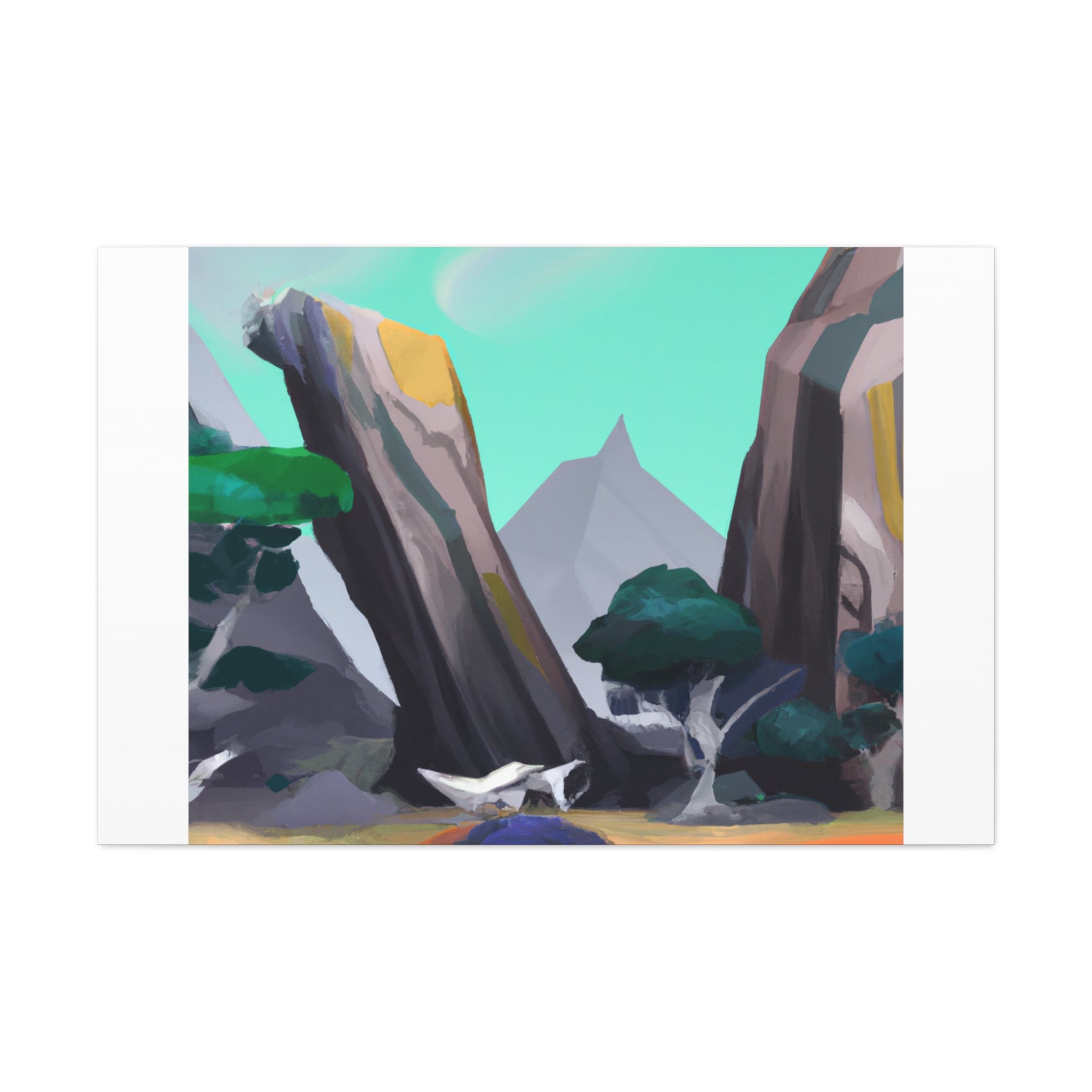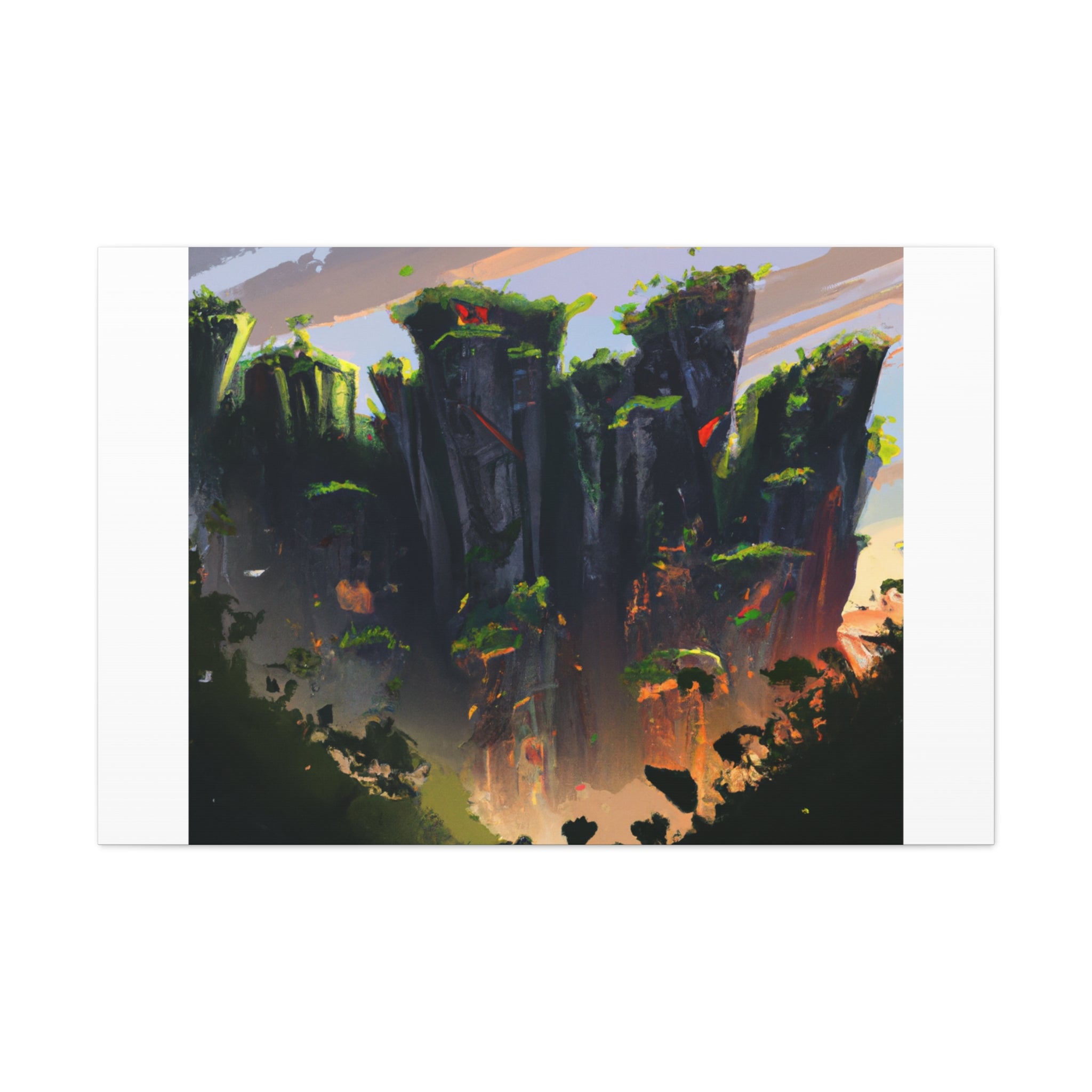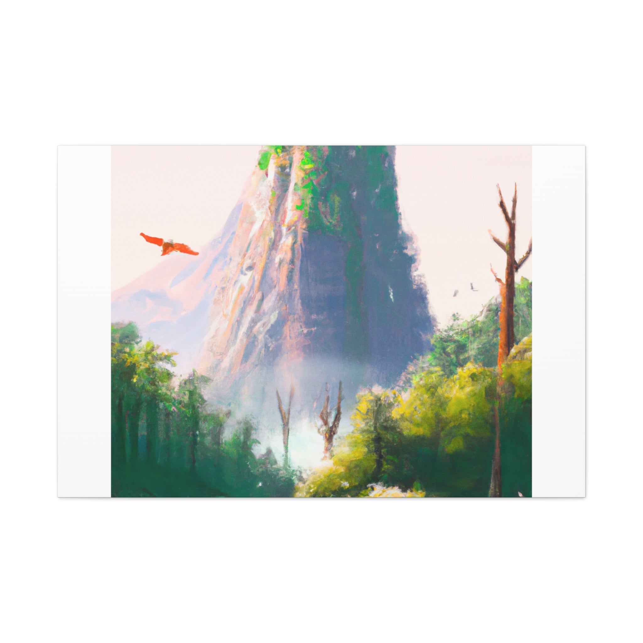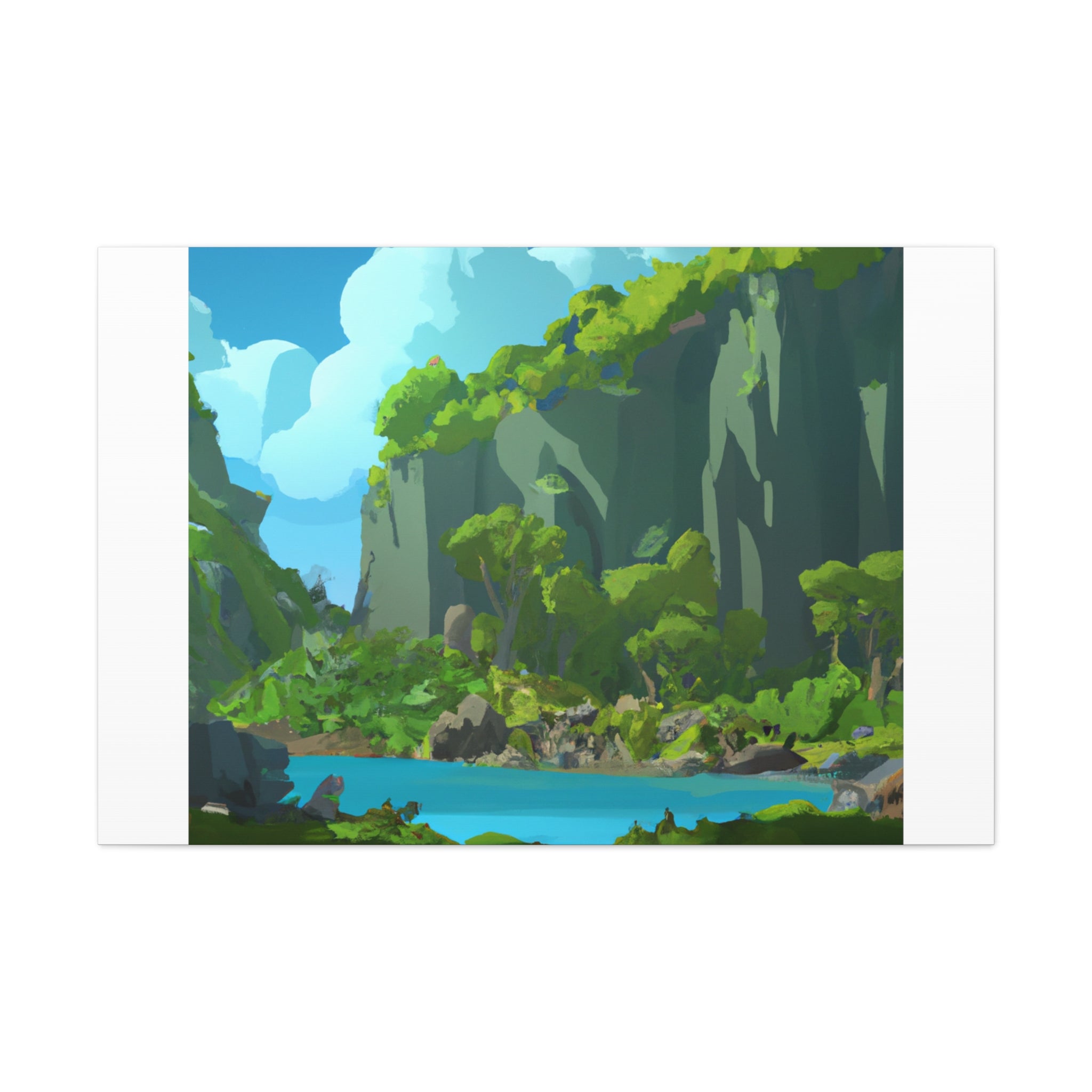 This restful landscape scene canvas is perfect for your living room. Featuring stunning digital art of cliffs and towering trees, this canvas will add a sense...